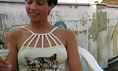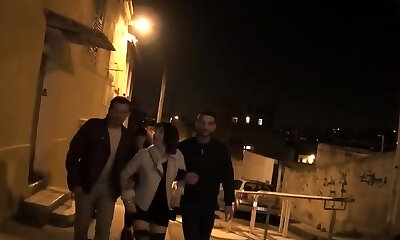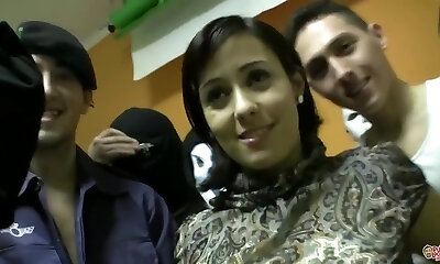 красивая брюнетка на улице наслаждается тем, как ее трахают в оргии с похотливыми парнями